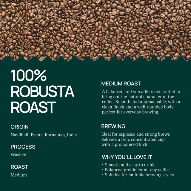 Bold and powerful, our 100% Robusta delivers a strong body with higher caffeine content and an intense aroma. With deep earthy and nutty notes, this coffee creates a thick crema and a punchy flavor—ideal for strong coffee lovers.